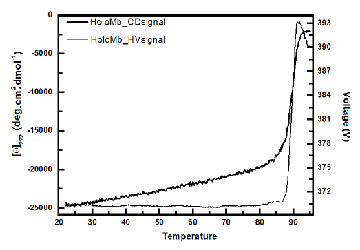 Circular dichroism spectra of HoloMyoglobin (Mb) as a function of temperature. Circular dichroism measurements were recorded using a Jasco J-810 spectropolarimeter with 10 mm pathlength cell following the signal at 222 nm and the dynode voltage V as a function of temperature. A heat-induced change in the dynode voltage is originated from variations in the light scattering which depends on the particle size and thus from aggregation. The transitions indicate that the protein unfolds as verified by the decrease in CD signal and aggregates as verified by the increase in the voltage which is related to light scattering. A non-aggregated protein would have shown a constant dynode voltage throughout the whole scan.